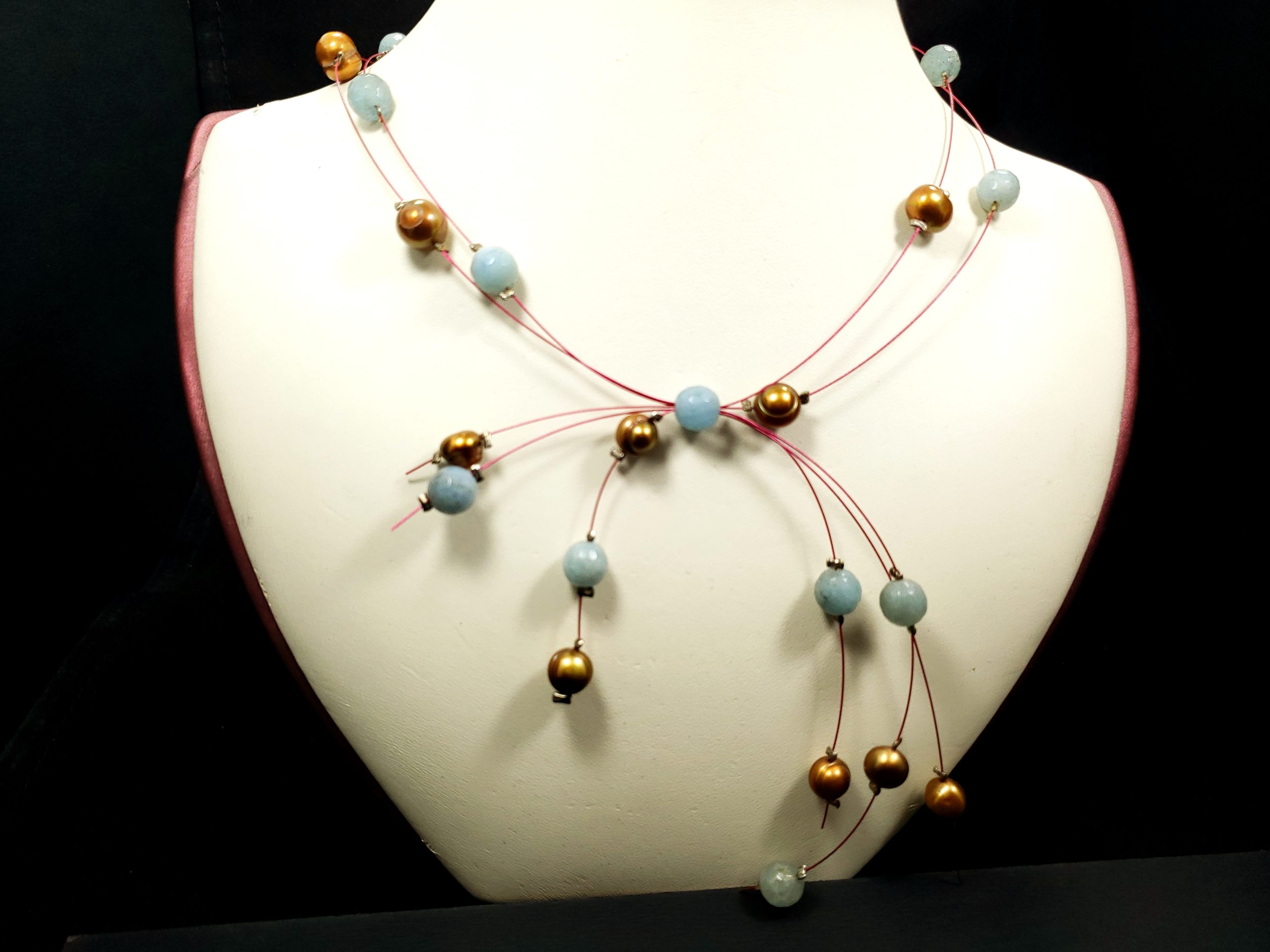 This is a Aquamarines and Pearls illusion necklace. It made out of Aquamarine beads and fresh water golden Pearls strained into pink cables.