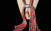 This is a Red Gray fabric Statement Necklace. Accessories to keep you warm through autumn and spring. It’s a long multipale yarns Necklace embellished with wire wrapped Jasper Sterling silver pendant.