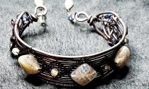Labradorite woven Bangle made of bare copper which is patined. Its diameter is about 2.5 inches.