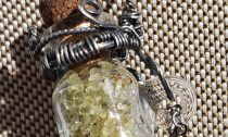 This Necklace is a peridot(olivine) in vial, wire wrapped with patinated sterling silver and silver plated chain. We found this Olivine vial among overwhelming Gems and Mineral stones there, when we visited Tucson Gem and Mineral Show in 2020.