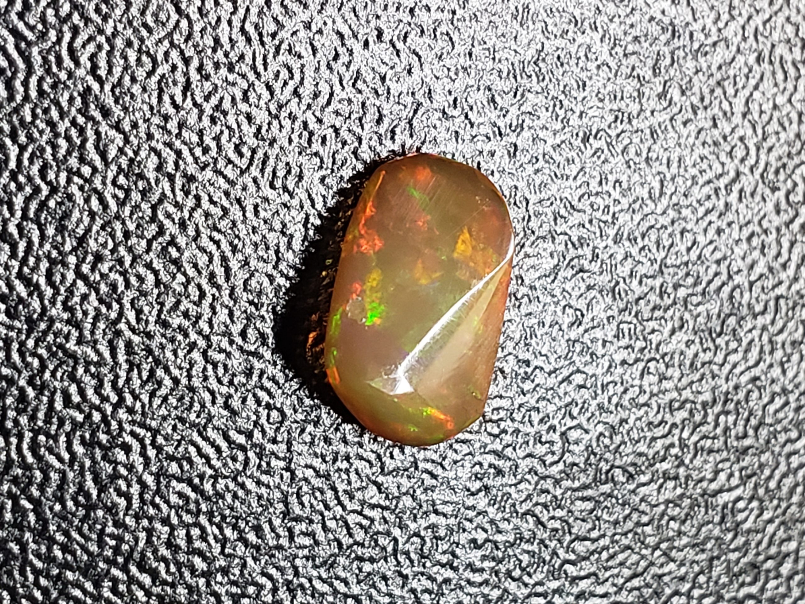 This is a polished Opal. Its weight about 0.60ct. It is little however bright. The measurements about 5 × 8.25 milimeter.