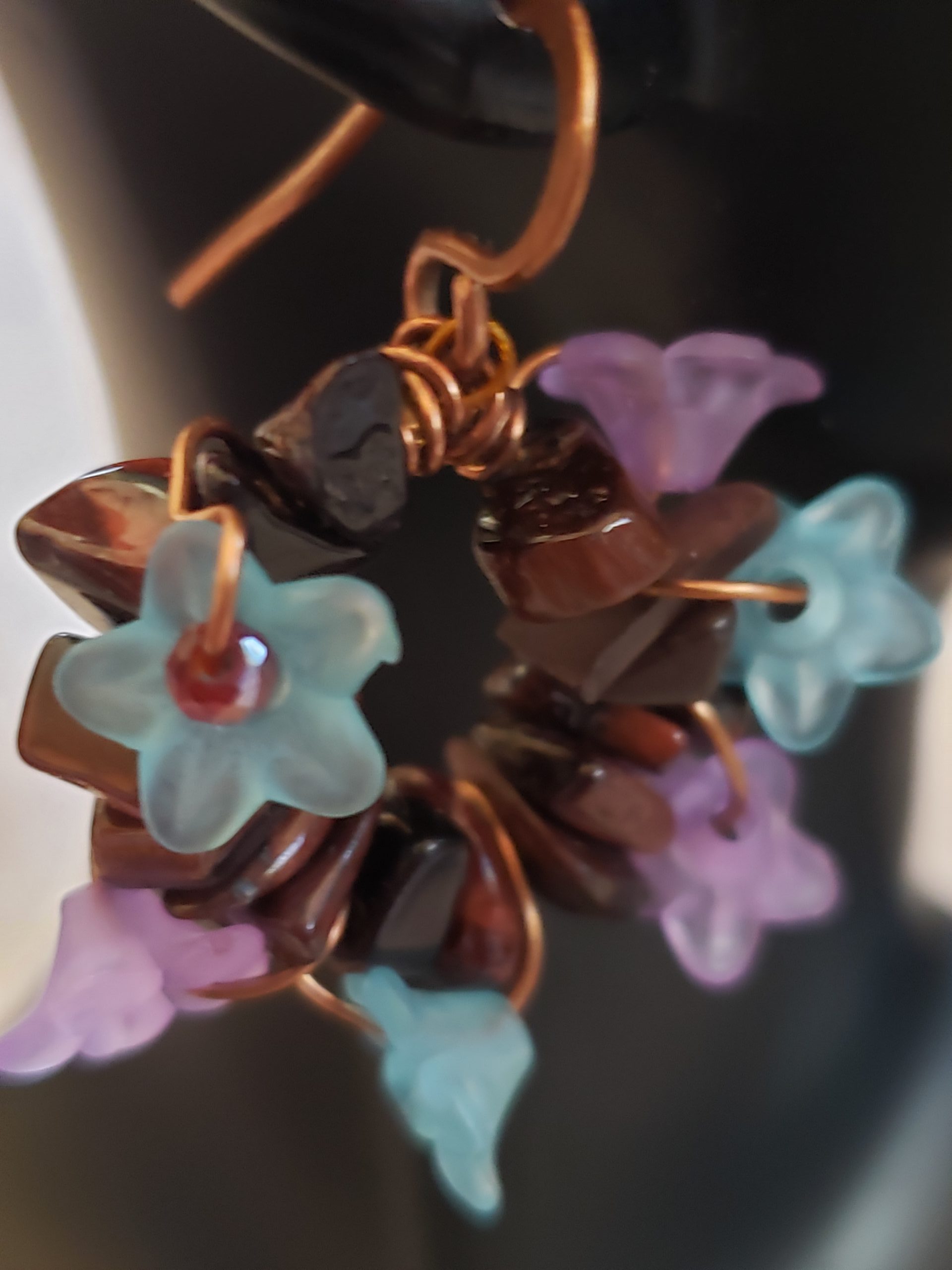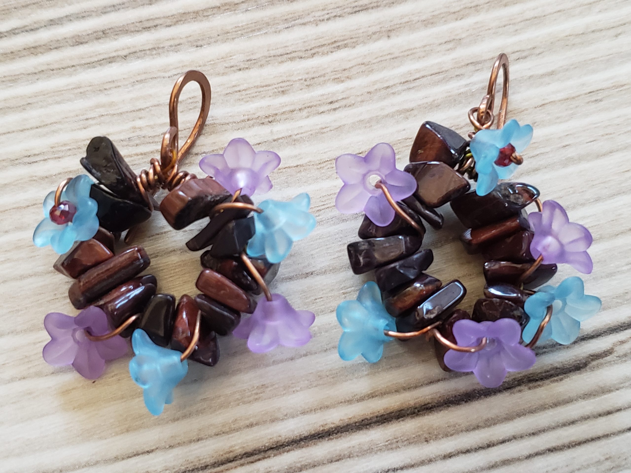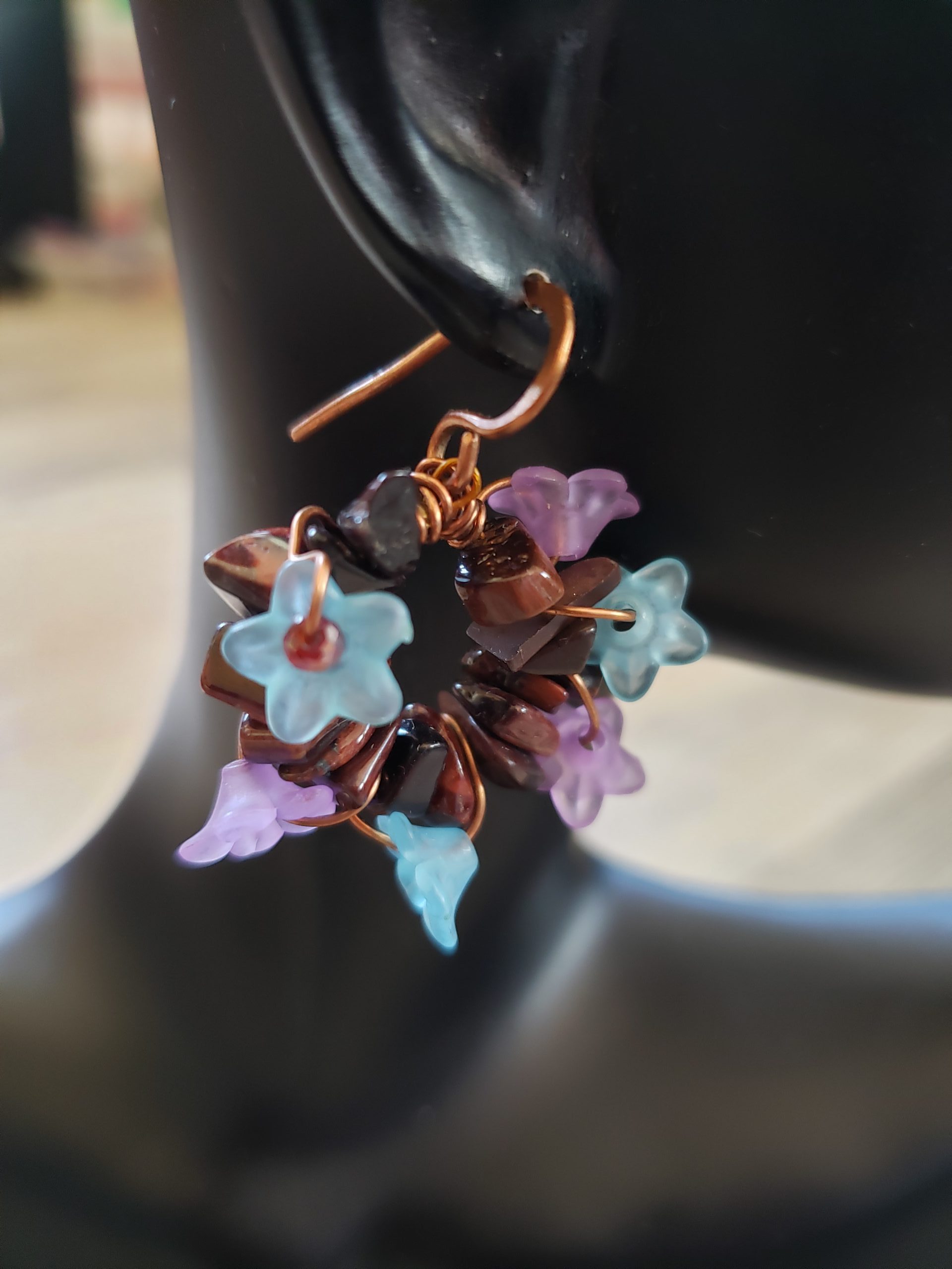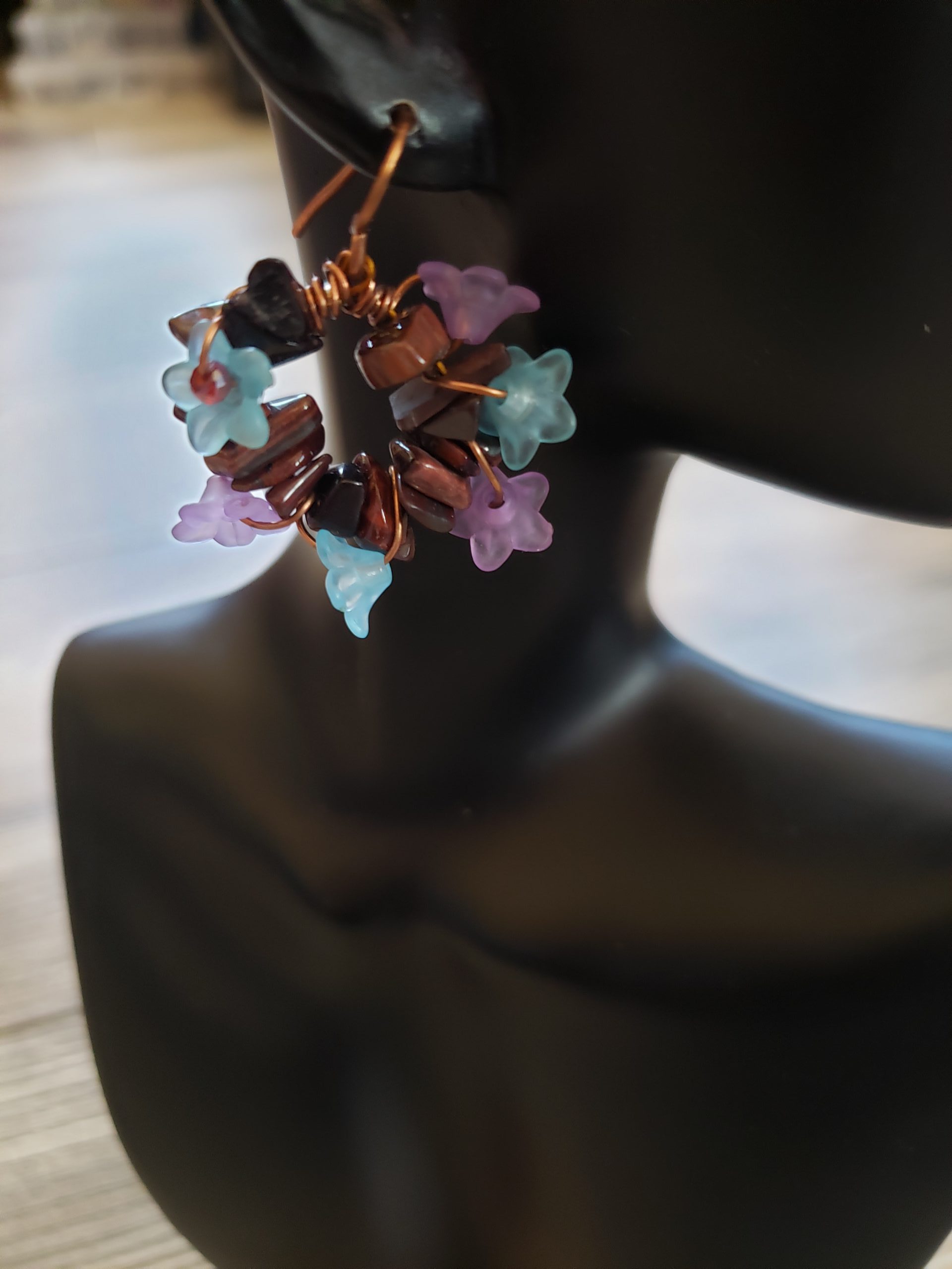 This is a Copper earring. It is a tiger eyes wreath earrings with acrylic little Lucite flowers in violet and blue. The copper Patinated