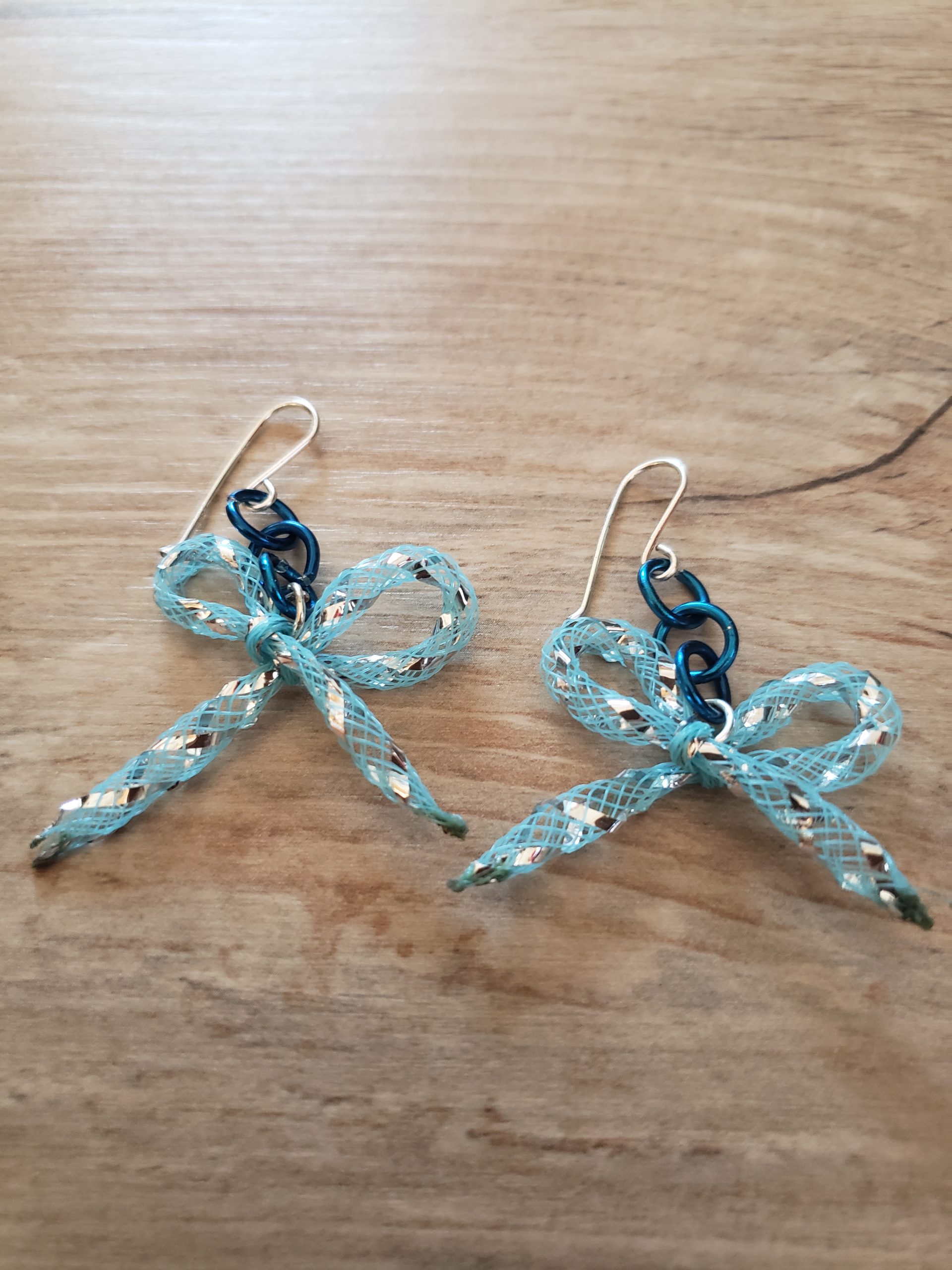 These are very light wight dangle earrings. Made out of plastic ribbon tube, coated aluminum wire with silver plated hooks. Available in blue, green and pink.