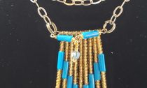 This is a Siver plated necklace with gold blue Seedbeads. This necklace is about 17 inches long. It’s beautiful and simple for easy going robe.