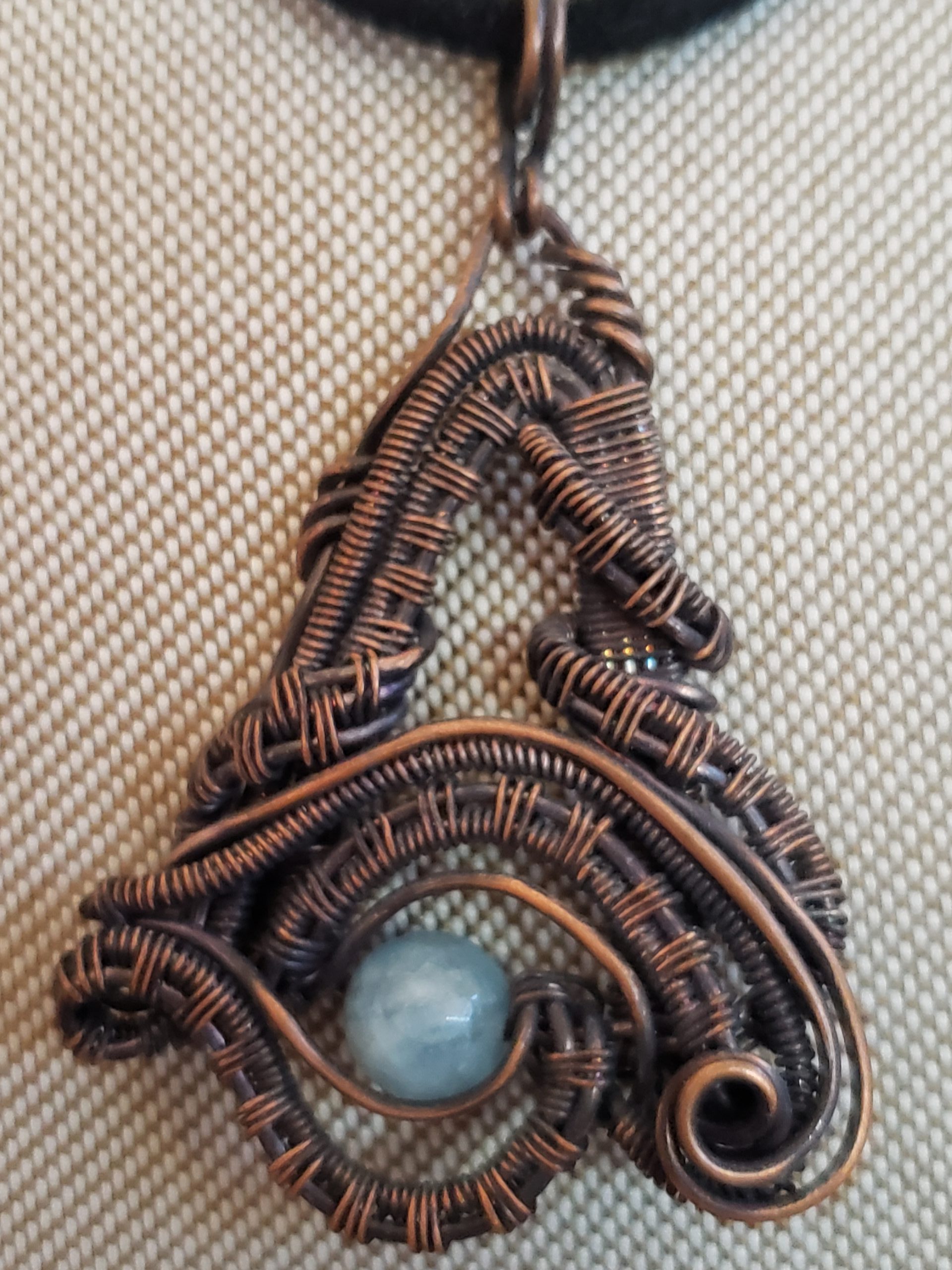 This is a patinated Copper pendant. It's a eye wire wrapped copper in a trigle with Aquamarine bead.